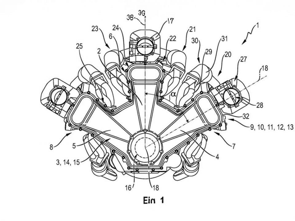 The patent application says each bank is modular, so the engine can be reconfigured to include three (W9), five (W15) or six cylinders (W18) in each back, and each cylinder block is short to take up less overall space.